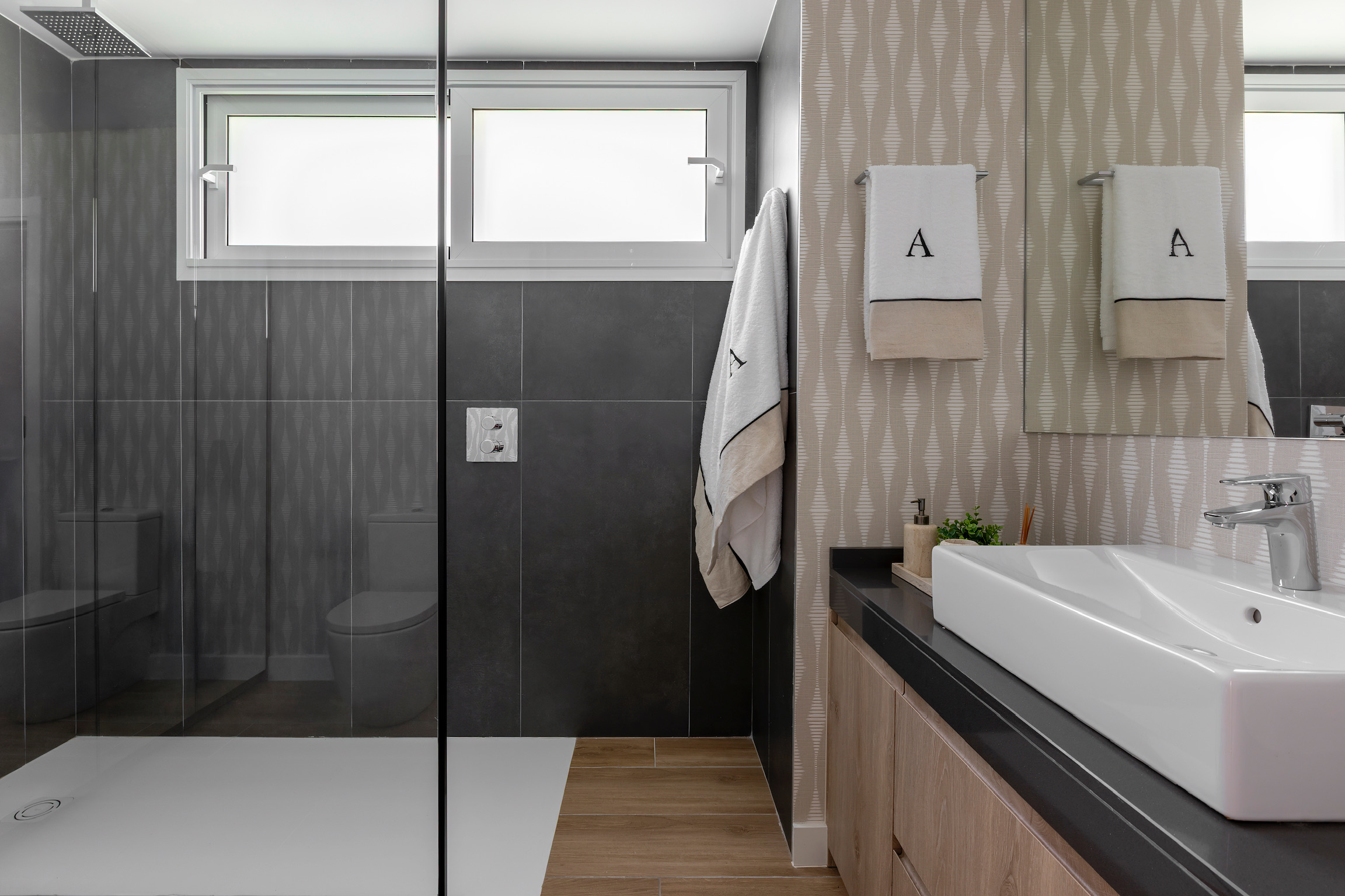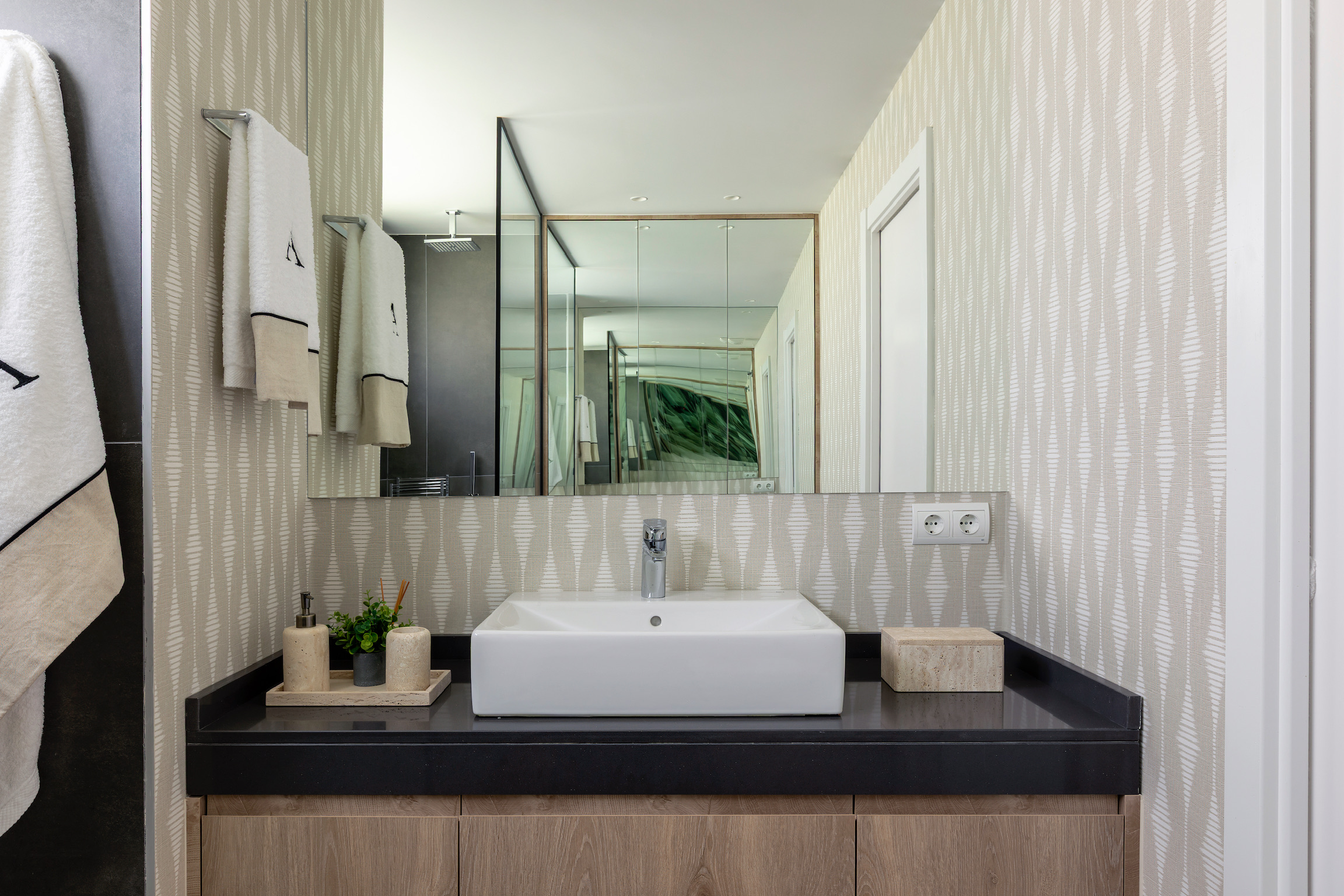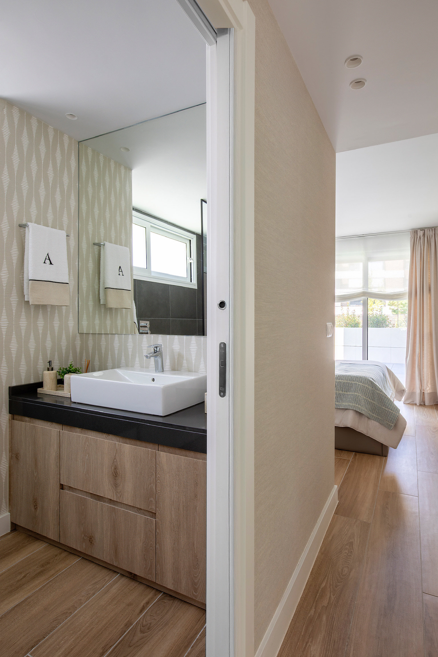 Destacamos la habitación principal, donde el baño integrado aporta modernidad y confort. La continuidad de los materiales y la iluminación cálida crean una atmósfera relajante, donde la estética se une a la funcionalidad.