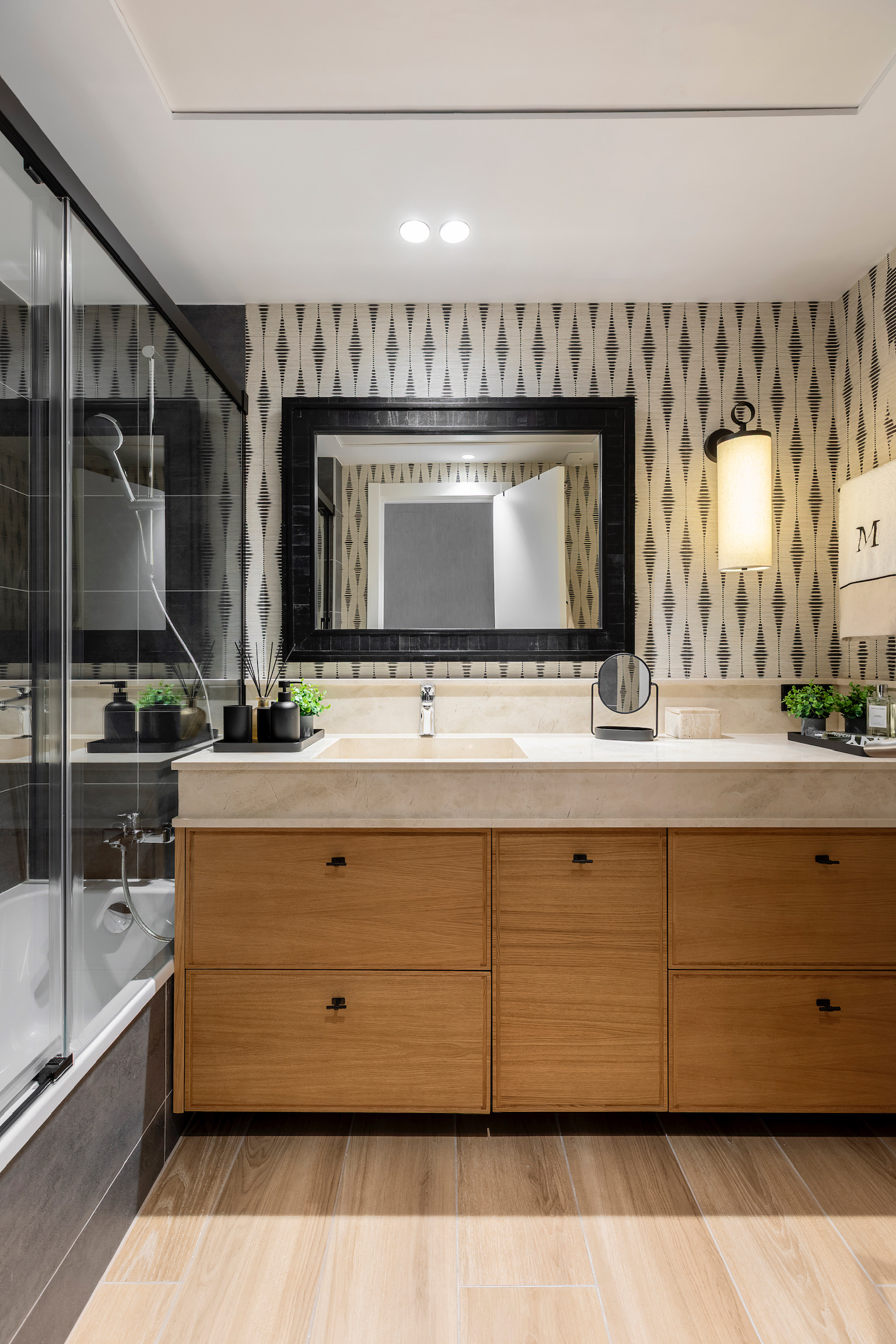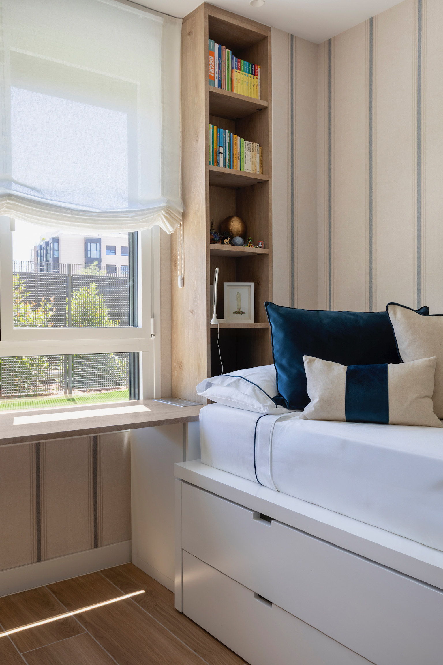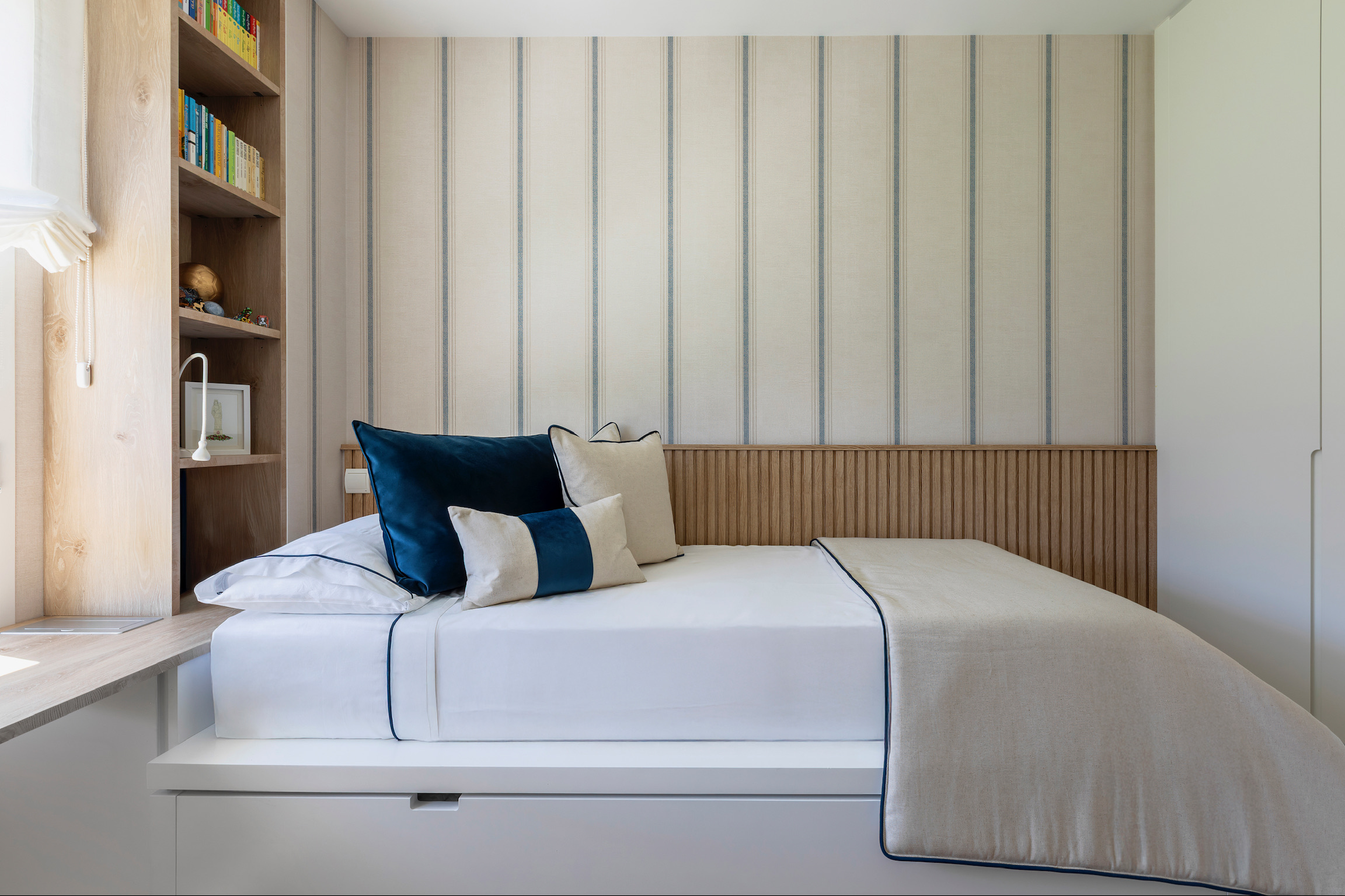 Destacamos la habitación principal, donde el baño integrado aporta modernidad y confort. La continuidad de los materiales y la iluminación cálida crean una atmósfera relajante, donde la estética se une a la funcionalidad.
