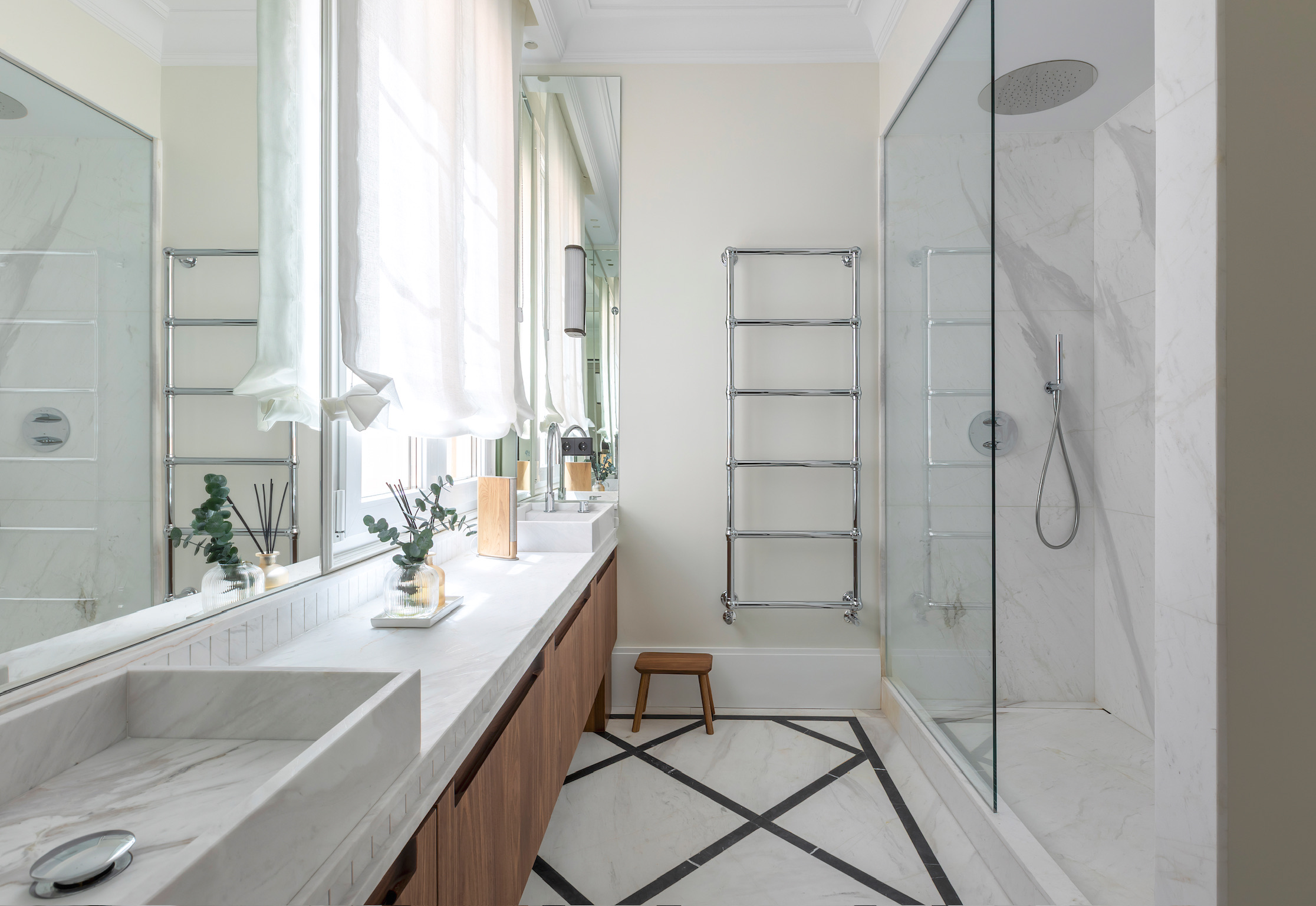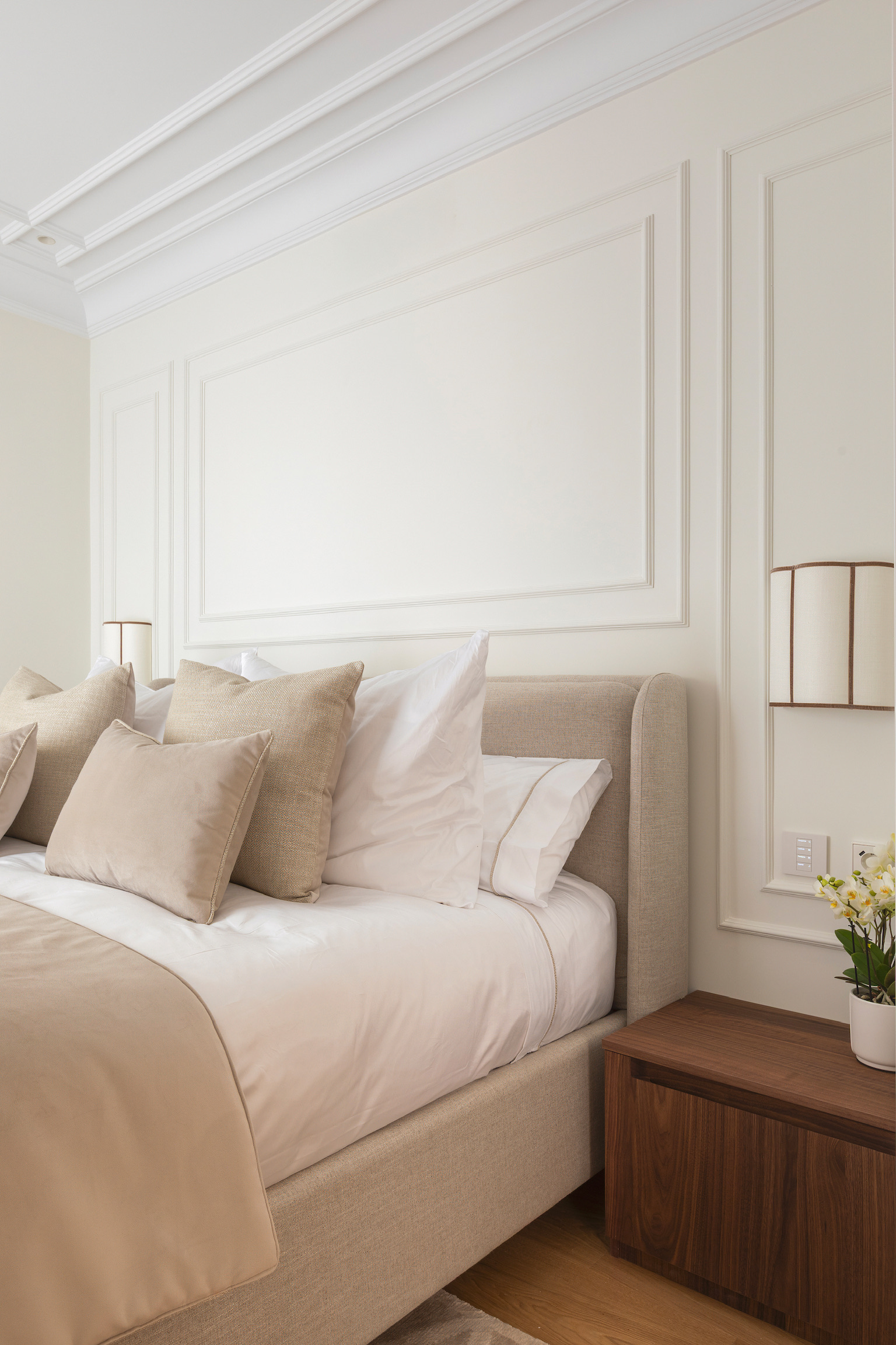 Cada detalle ha sido cuidadosamente seleccionado para crear un ambiente de elegancia y sofisticación. Los materiales nobles son los grandes protagonistas: mármol de Carrara, madera de roble natural en las espigas del suelo, y molduras que evocan la grandiosidad de antaño. La pureza del color blanco baña cada rincón, ampliando el espacio y potenciando la luz natural que inunda las estancias.